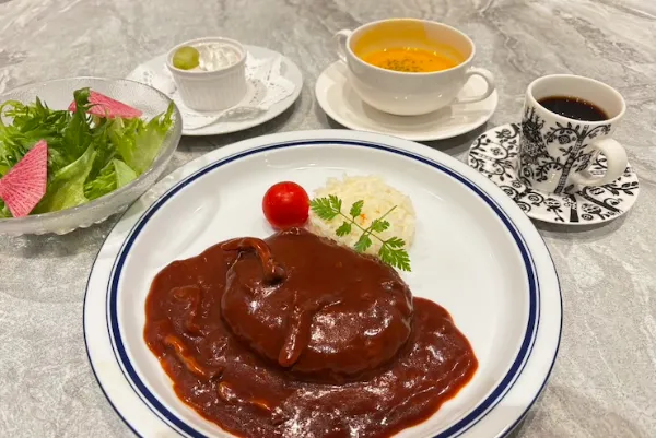愛媛県産の伊予牛を使用し、やわらかさと旨みを大切にしながら、 一つひとつ丁寧に焼き上げています。 仕上げには、濃厚なデミグラスソースを添えました。 お肉の旨みと相性の良いソースが引き立てる、世代を問わずお楽しみいただける一皿です。